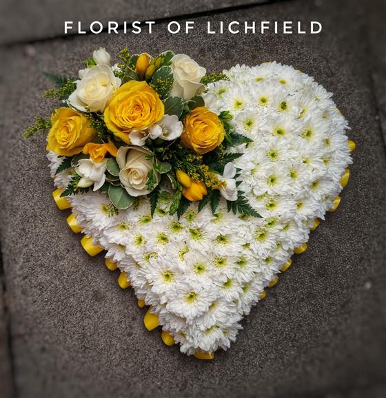 A beautifully crafted heart-shaped floral tribute, designed to express deep love and heartfelt sympathy. This massed heart features a base of fresh white chrysanthemums, symbolizing purity and peace, and is finished with a delicate spray of flowers and seasonal foliage in your chosen colors.