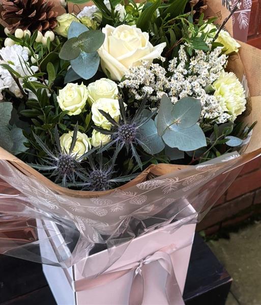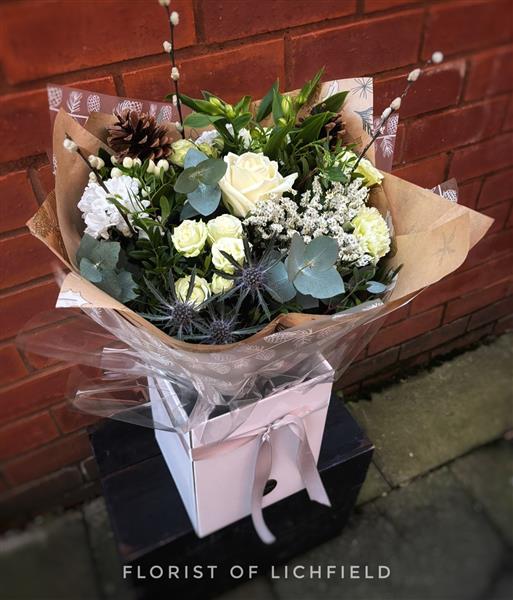 Not sure what to choose? Our florists will design a beautiful Christmas bouquet in elegant frosty neutrals, using a mix of seasonal flowers and foliage.